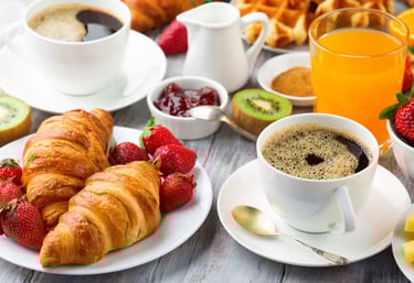 Delicious continental breakfast with pastries, fruits, coffee, juice, and more.
